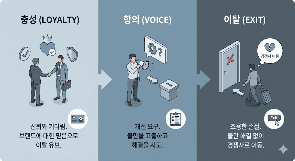 이탈 (Exit): "절이 싫으면 중이 떠난다." 불만을 해결하려 애쓰지 않고 조용히 경쟁사로 옮겨가는 행동입니다.