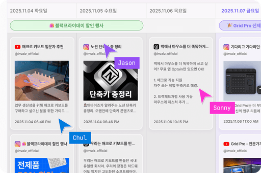 캠페인, 출시, 이벤트 등 브랜드의 흐름에 맞춰 모든 콘텐츠 일정을 한눈에 관리할 수 있습니다.