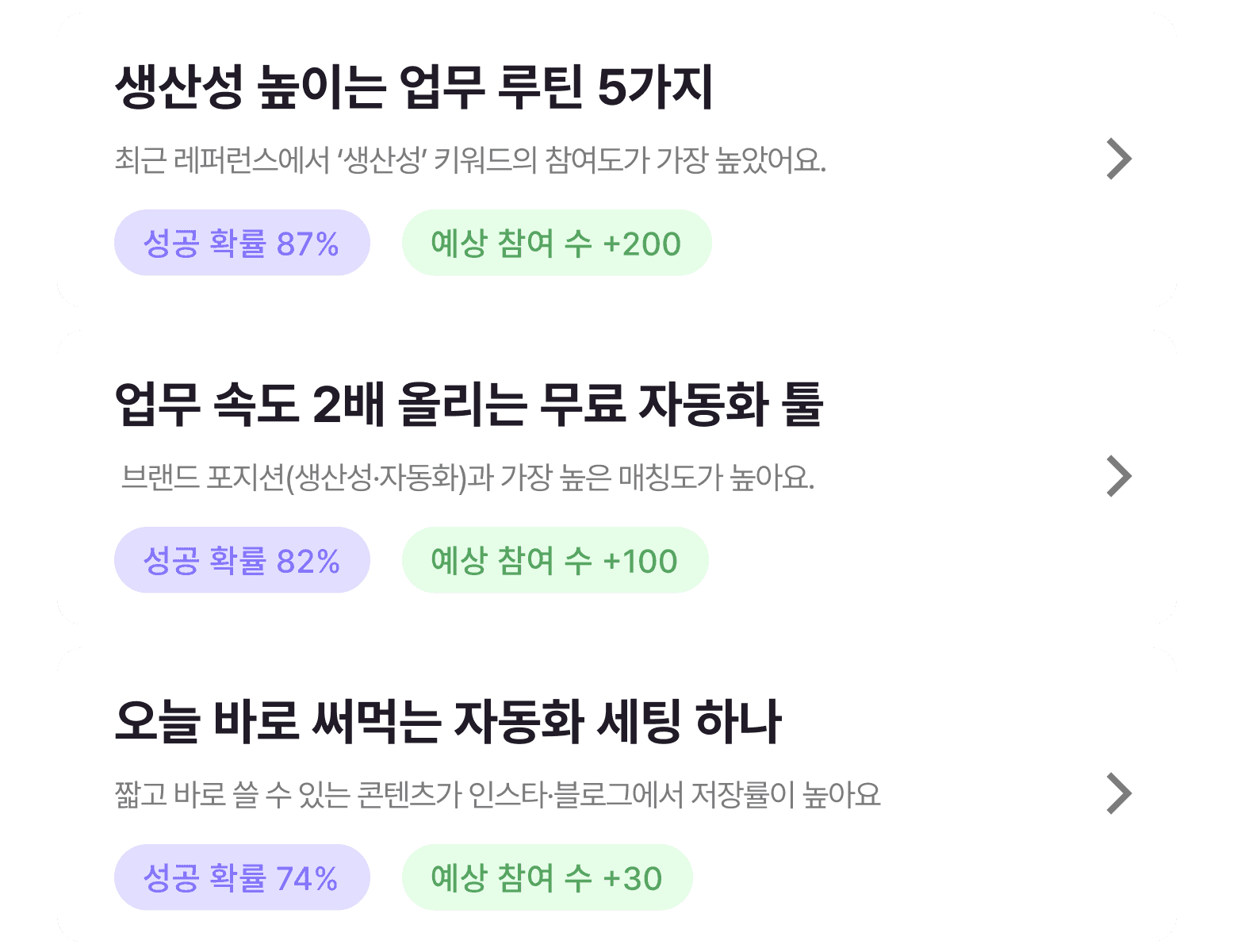 데이터 기반으로 잘되는 콘텐츠의 기준을 알려드리고, 다음에 무엇을 만들지까지 자연스럽게 이어드립니다.