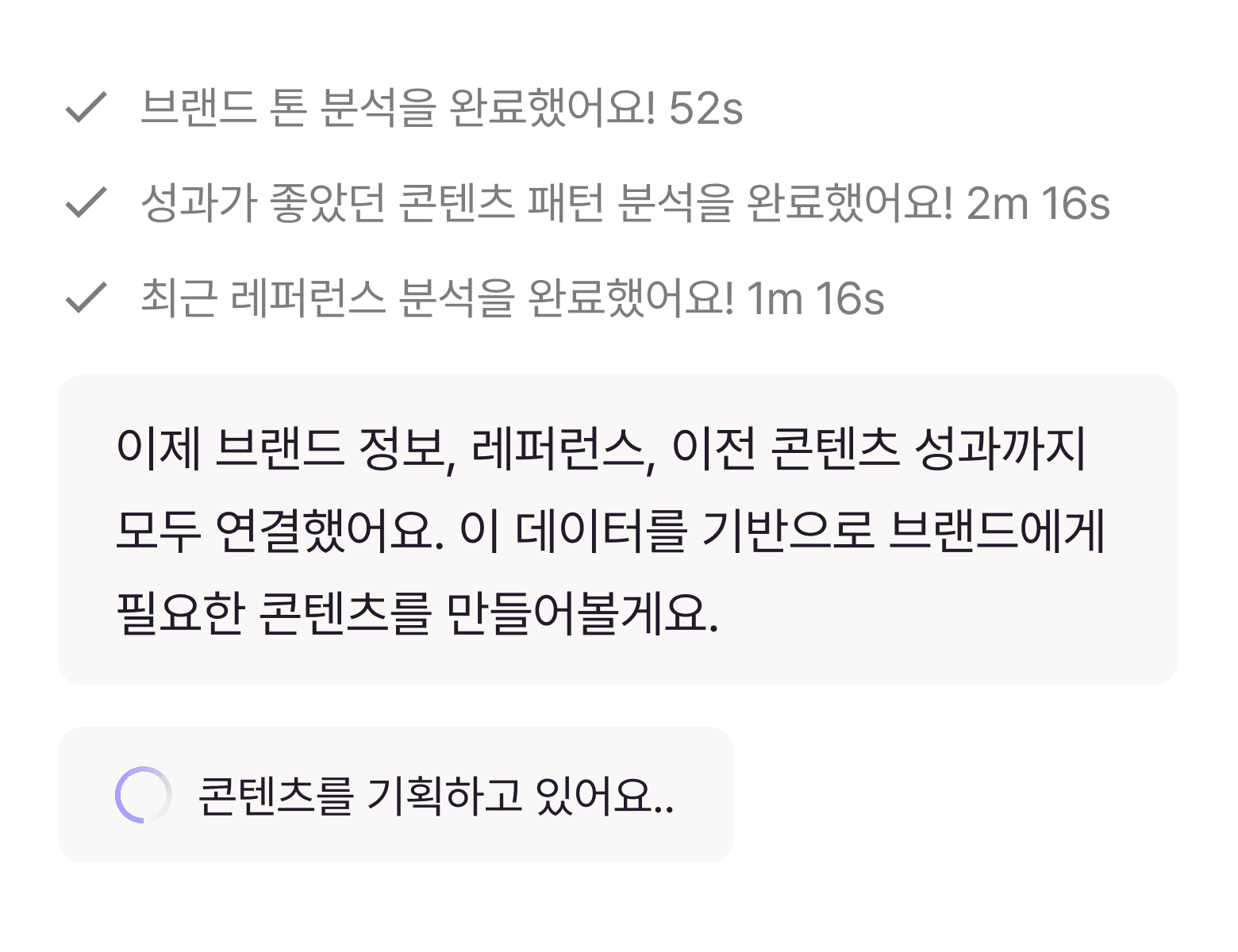 브랜드 정보·레퍼런스·성과 데이터를 모두 연결해 지금 만들면 좋은 콘텐츠와 다음 전략까지 제안해드려요.